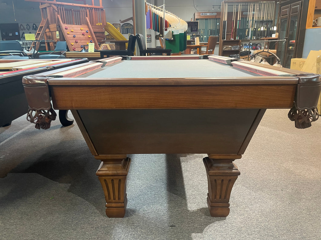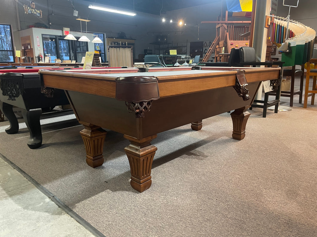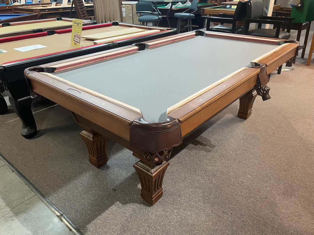 This table is brand new and in excellent condition. We've added these great looking solid wood fluted legs to one of our TC NAZ plywood bodies. Solid wood TC NAZ top rails and leather fringe pockets make this an excellent quality TC NAZ pool table. We've put brand new cushions on this table and will refelt it with a new felt in your choice of color.