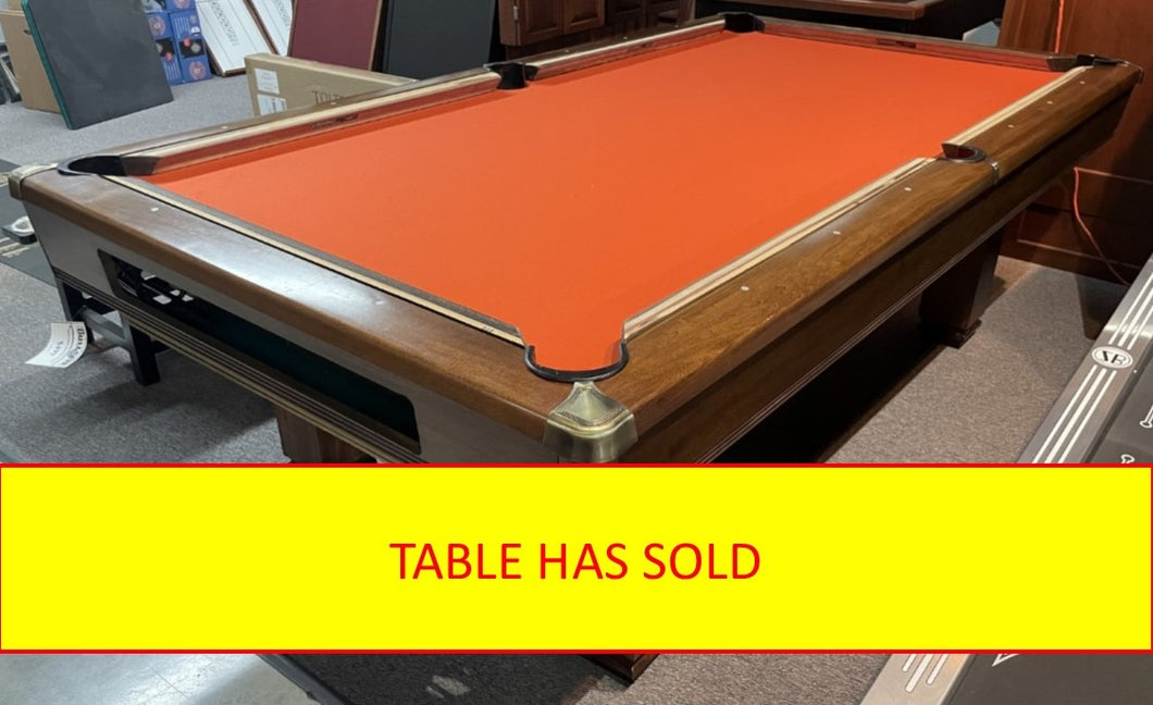 This used 8ft Brunswick Hawthorn is in great condition. This table's sleek contemporary styling and brass-finished rail corner covers compliment the Hawthorn's solid hardwood construction to help make this one great looking pool table. This model has ball return pockets. This table has Brunswick's SUPERSPEED cushions and we will refelt the pool table with a brand new felt in your choice of color.