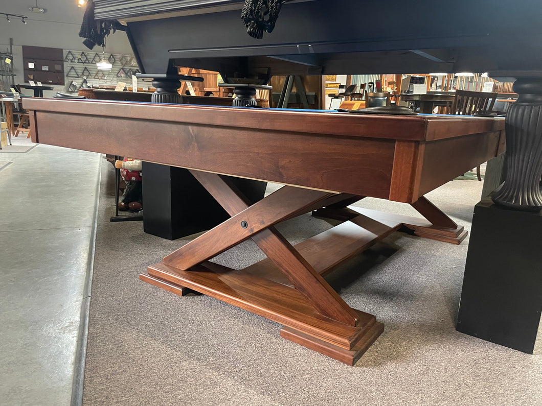 This 8ft Mya table is in excellent condition. Built with a solid maple wood body, blind and intersecting cross beam leg. Table is stained with a beautiful Micheal's Cherry stain, has 9/16 round mother of pearl sights. Both a gorgeous piece of furniture and great playing pool table. A short blind completes this enclosed pocket table's modern look.